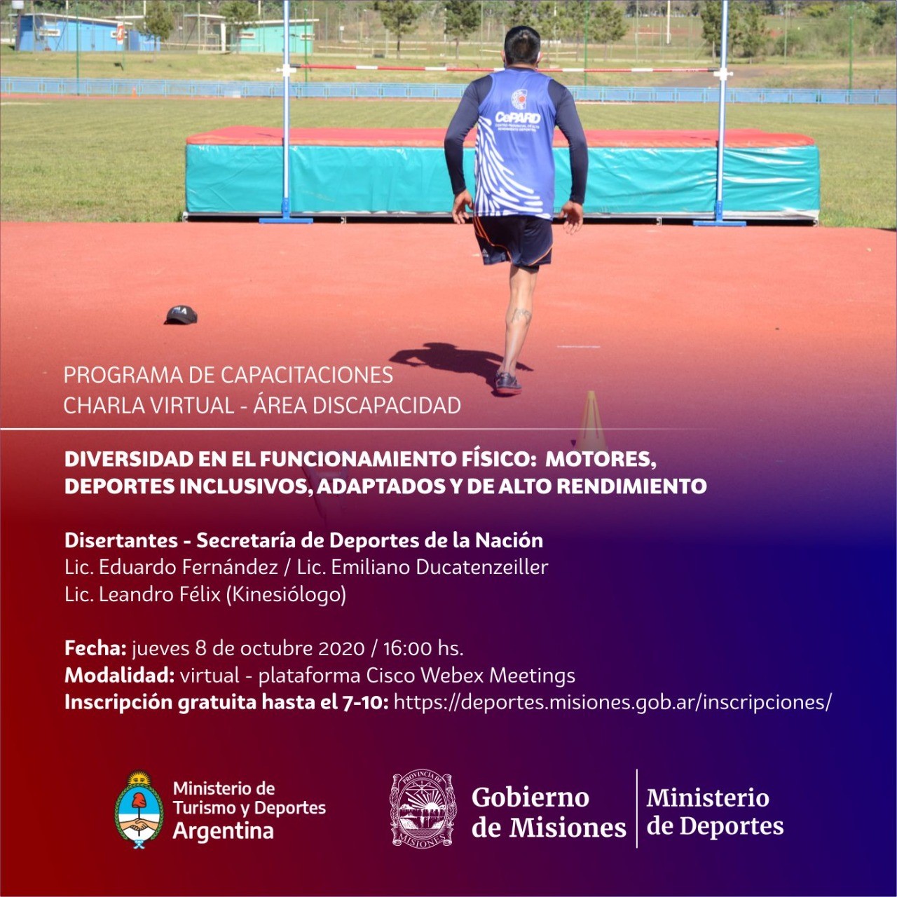 El Ministerio de Deportes de Misiones, junto a la Secretaría de Deportes de la Nación, llevará adelante una capacitación virtual, destinada al área de Discapacidad, denominada Diversidad en el funcionamiento físico: motores, deportes inclusivos, adaptados y de alto rendimiento.