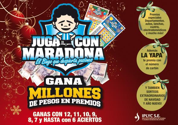 Para despedir el 2016, “Jugá con Maradona” reparte 55 millones de pesos en premios, y además de los pozos millonarios que ofrece todas las semanas, redobla las apuestas con los sorteos Súper Extraordinarios para terminar el año de la mejor manera. En los Sorteos N° 457, de Navidad (24 de diciembre) y N° 458, de Año Nuevo (31 de diciembre), propone 20 millones de pesos más una camioneta 4x4 0 kilómetro. La “Jugada de Fortunato” (8+4) repartirá cinco millones de pesos, mientras que el “Gol de Oro” tendrá diez extracciones de 20 mil pesos cada una.